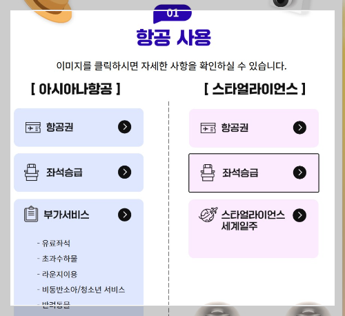 - 좌석 승급 시 혜택: 마일리지로 좌석을 승급하면 승급된 클래스에 따른 공항 서비스(체크인 카운터, 라운지 이용 등)와 무료 수하물 허용량 혜택을 받을 수 있습니다.